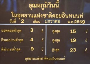 เชียงใหม่ (2 ม.ค. 69) – เริ่มต้นเช้าวันที่สองของปี 2569 อย่างสดใส บรรยากาศบนอุทยานแห่งชาติดอยอินทนนท์เช้านี้ (เวลา 07.00 น.) อุณหภูมิลดต่ำลงอย่างต่อเนื่อง ทำให้นักท่องเที่ยวได้สัมผัสอากาศหนาวจัด ท่ามกลางท้องฟ้าที่เปิดสว่างสดใสและทัศนียภาพที่งดงาม