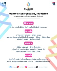 สมาคมกีฬาฟุตบอลแห่งประเทศไทย ในพระบรมราชูปถัมภ์ ประกาศรายชื่อ 23 นักฟุตบอลหญิงทีมชาติไทย ชุดทำการแข่งขันมหกรรมกีฬาซีเกมส์ ครั้งที่ 33 ที่ประเทศไทยเป็นเจ้าภาพ ระหว่างวันที่ 4-17 ธันวาคม 2568 ณ ชลบุรี สเตเดียม ภายใต้การคุมทัพของ “โค้ชหนึ่ง” หนึ่งฤทัย สระทองเวียน หัวหน้าผู้ฝึกสอน