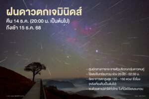 สดร. เตรียมจัดกิจกรรมสังเกตการณ์ “ฝนดาวตกเจมินิดส์” คืนวันที่ 14 ถึง รุ่งเช้า 15 ธันวาคม 2568 เชิญชวนผู้สนใจเข้าร่วมกิจกรรม ณ จุดสังเกตการณ์หลัก 4 แห่ง ดังนี้