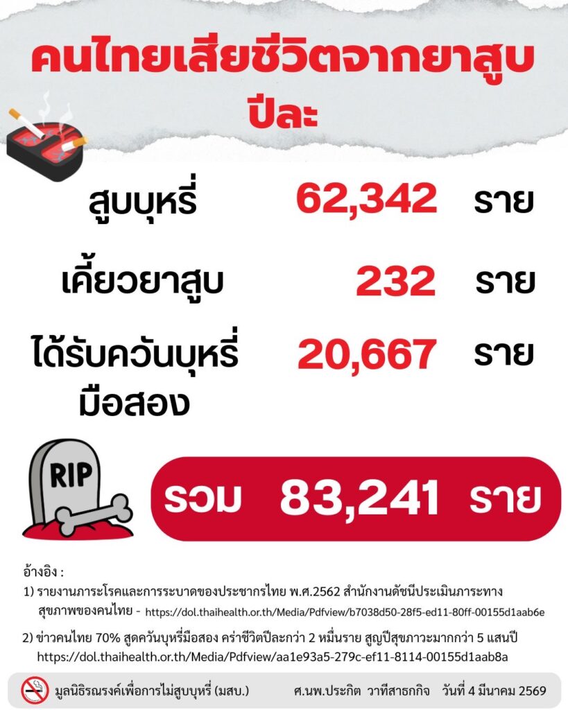 ผู้เชี่ยวชาญองค์การอนามัย ประเมินว่า กรณีประเทศไทย ทุกหนึ่งคนที่เสียชีวิตจากการสูบบุหรี่ จะมีคนป่วยจากการสูบบุหรี่ที่ยังมีชีวิตอยู่ 20 คน คนไทยเสียชีวิตจากการสูบบุหรี่ปีละ 62,342 คน จากการเคี้ยวยาสูบ 232 คน (2)และจากการได้รับควันบุหรี่มือสอง 20,667 คน(3)