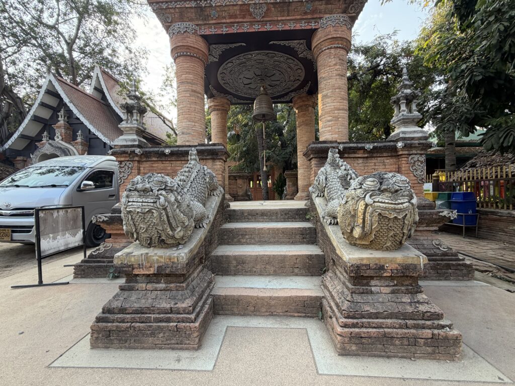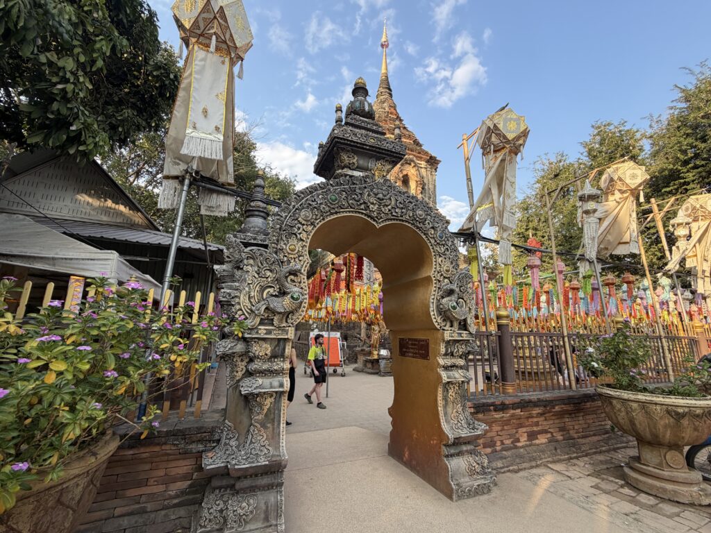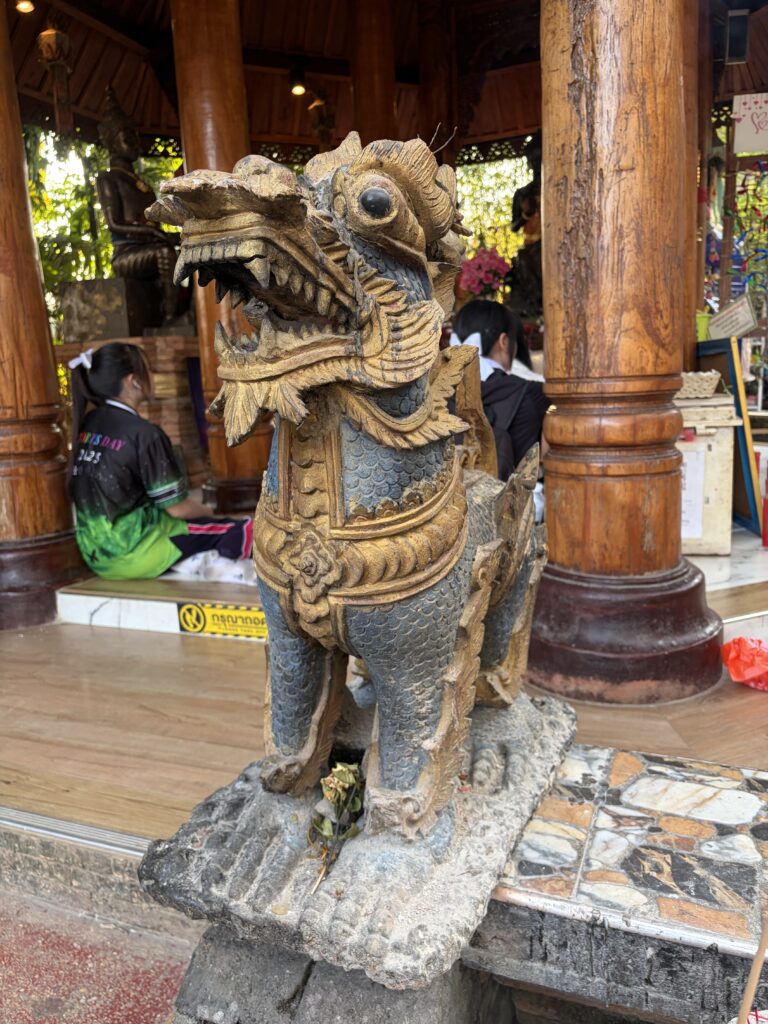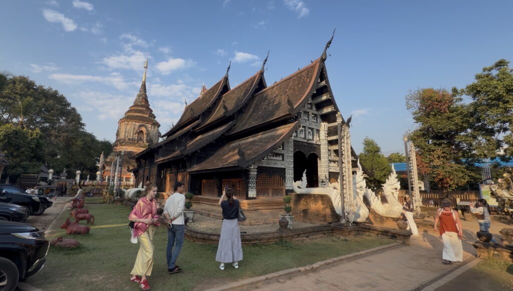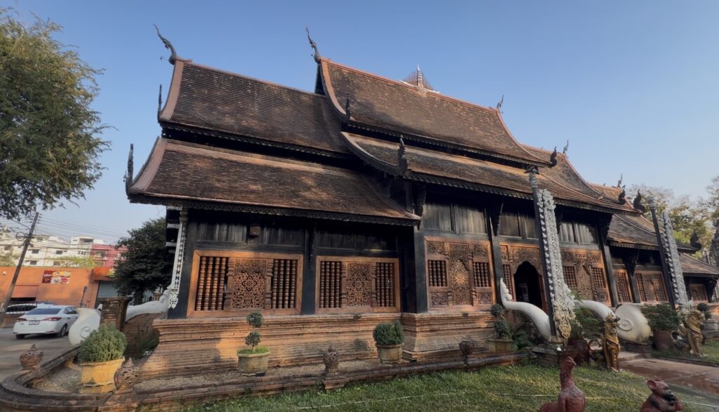นอกจากนี้ยังมี “วิหารหลวงไม้สัก” ศิลปะแบบล้านนาแท้ ที่โดดเด่นด้วยหน้าบันรูปจั่วประดับกระจกสีระยิบระยับบนพื้นหลังสีดำ ภายในประดิษฐาน “พระพุทธสันติจิรบรมโลกนาถ” พระพุทธรูปปางสมาธิที่ประณีตงดงาม พร้อมบรรจุพระบรมสารีริกธาตุไว้บนพระเมาลี เป็นที่พึ่งทางใจของชาวเชียงใหม่มาอย่างยาวนาน