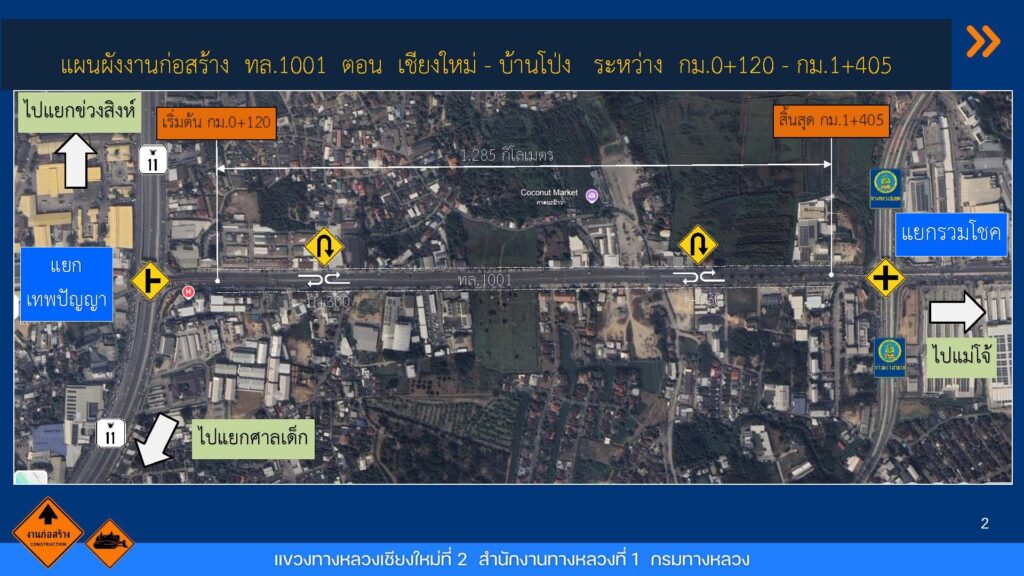 โครงการก่อสร้างผิวทางคอนกรีต ทางหลวงหมายเลข 1001 แยกเทพปัญญา-แยกรวมโชค ระหว่าง กม.0+120-กม.1+405ระยะทาง 1.28 5กิโลเมตร.เริ่มสัญญา 24 มกราคม 2568 -สิ้นสุดสัญญา 21 สิงหาคม 2568 ระยะเวลา 210 วัน ลักษณะงานประกอบด้วย 3 Item ได้แก่ 1. งานรื้อผิวทางแอสฟัลต์ที่ชำรุด 2. ก่อสร้างผิวทางคอนกรีตหนา 25 CM. และ 3. ทำเครื่องหมายจราจร