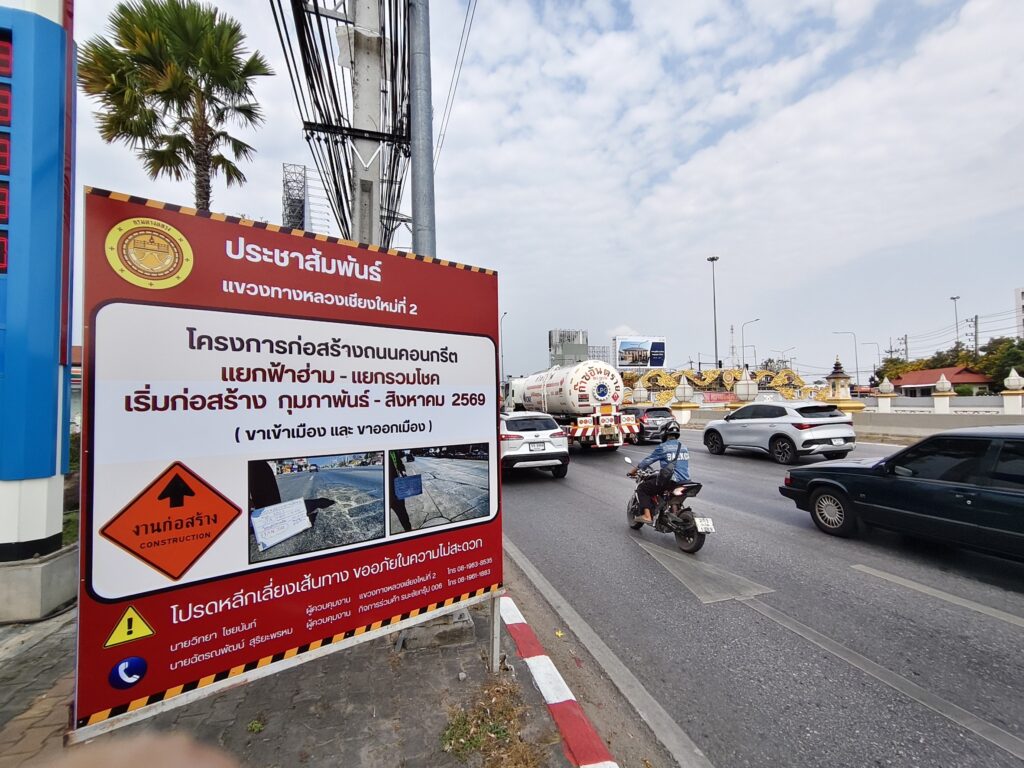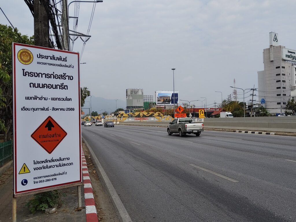 “จะทำเป็นช่วงๆ ในเดือนกุมภาพันธ์มีการวางแผนและเริ่มดำเนินการไปแล้ว ในช่วงที่ 1 ซึ่งแต่ละช่วงจะใช้เวลาดำเนินการประมาณ 30 วัน ซึ่งช่วงที่ 1 ได้เริ่มดำเนินการแล้วคาดว่าจะเร่งงานให้เสร็จก่อนเทศกาลสงกรานต์ ซึ่งช่วงเทศกาลสงกรานต์นี้จะพยายามเก็บงานให้เสร็จ และจะเปิดให้รถสามารถสัญจรได้ ทั้ง 6 ช่องจราจรเหมือนเดิม ทำงานเสร็จก็จะเปิดผิวจราจรได้ โดยที่คอนกรีตที่ใช้ในโครงการนี้ ใช้คอนกรีตชนิดพิเศษ ที่เซ็ตตัวได้ไว มีค่า Strength ที่สูง เพื่อให้เร่งเปิดผิวจราจรให้ได้ไว หมายความว่าจะเร่งงานก่อนสงกรานต์ พอช่วงสงกรานต์ก็จะคืนผิวการจราจรให้ทั้งหมด หลังสงกรานต์ก็จะไปทำช่วงที่ 2 ต่อ” ผู้อำนวยการแขวงทางหลวงเชียงใหม่ที่ 2 กล่าว