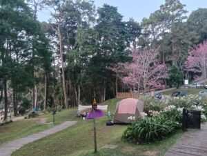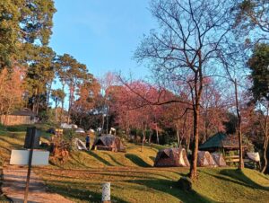 บริเวณลานกางเต็นท์ดอยปุย ภายในอุทยานแห่งชาติดอยสุเทพ-ปุย จ.เชียงใหม่ นักท่องเที่ยวขึ้นมาสัมผัสอากาศบริสุทธิ์ยามเช้า โดยไฮไลท์สำคัญในวันนี้คือ ดอกนางพญาเสือโคร่ง หรือซากุระเมืองไทย ที่ปลูกอยู่รายรอบพื้นที่ลานกางเต็นท์และสถานีวิจัยดอยปุย เริ่มทยอยผลิบานเป็นสีชมพูอ่อนสลับกับสีเขียวของสนเขา ท่ามกลางไอหมอกบางๆ และอุณหภูมิที่เย็นสบายเพียง 13 องศาเซลเซียส