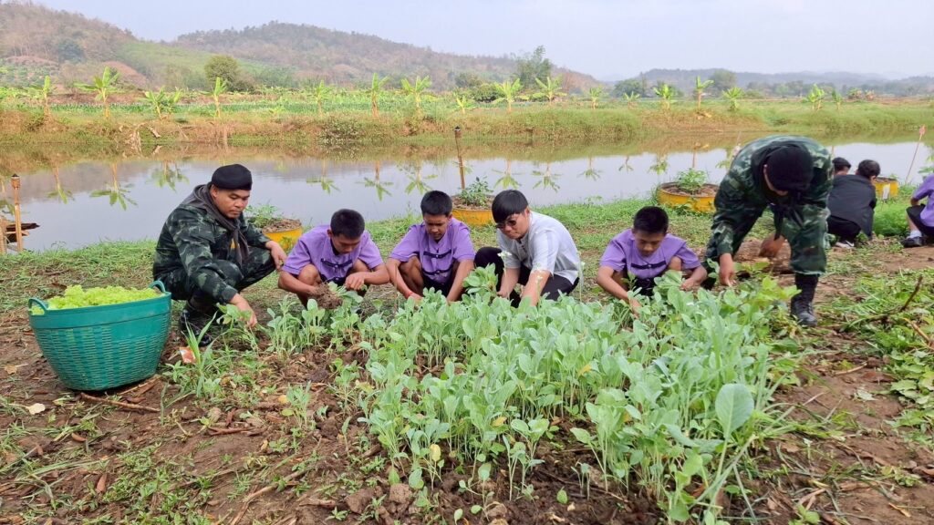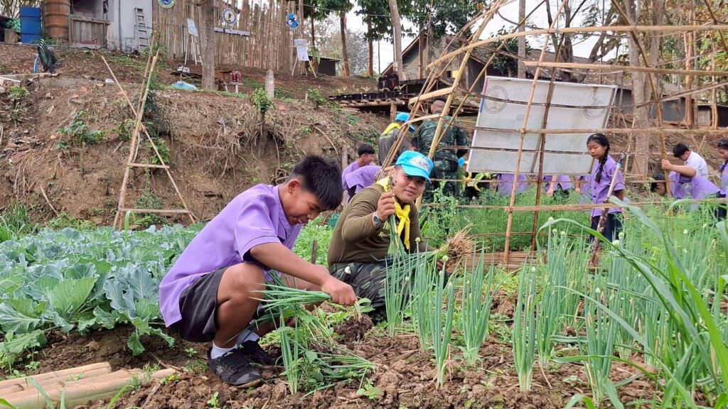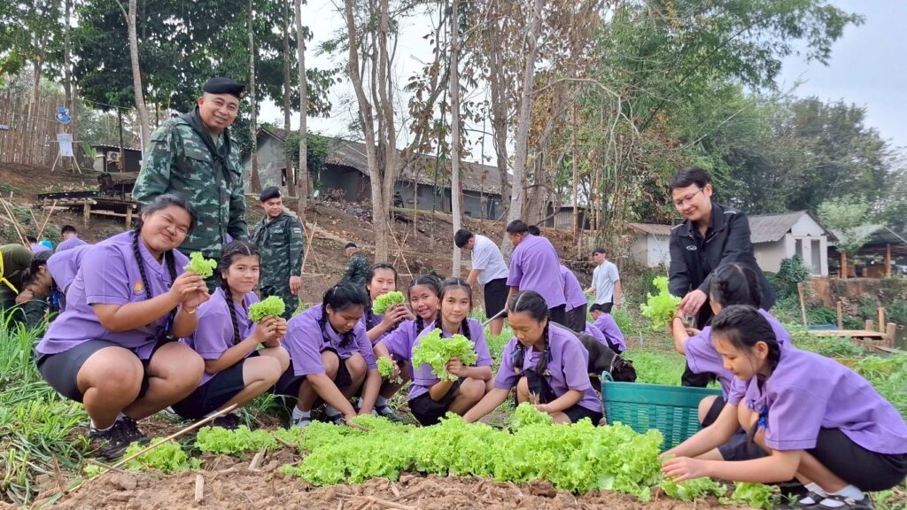 กิจกรรมในครั้งนี้มุ่งเน้นให้นักเรียนได้ลงมือปฏิบัติจริงในแปลงเกษตรสาธิต เพื่อนำทักษะไปขยายผลต่อยอดในโรงเรียน ส่งเสริมการปลูกผักปลอดภัยไว้บริโภค นอกจากนี้ยังได้ร่วมกันเก็บเกี่ยวผลผลิตจากโครงการทหารพันธุ์ดี “ชุมชนเบิกบาน อาหารปลอดภัย” เพื่อใช้สนับสนุนโครงการอาหารกลางวัน ช่วยลดภาระค่าใช้จ่ายและสร้างความมั่นคงทางอาหารภายในสถานศึกษา ซึ่งสร้างความประทับใจและรอยยิ้มให้กับคณะครูและนักเรียนเป็นอย่างมาก