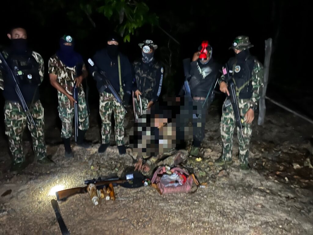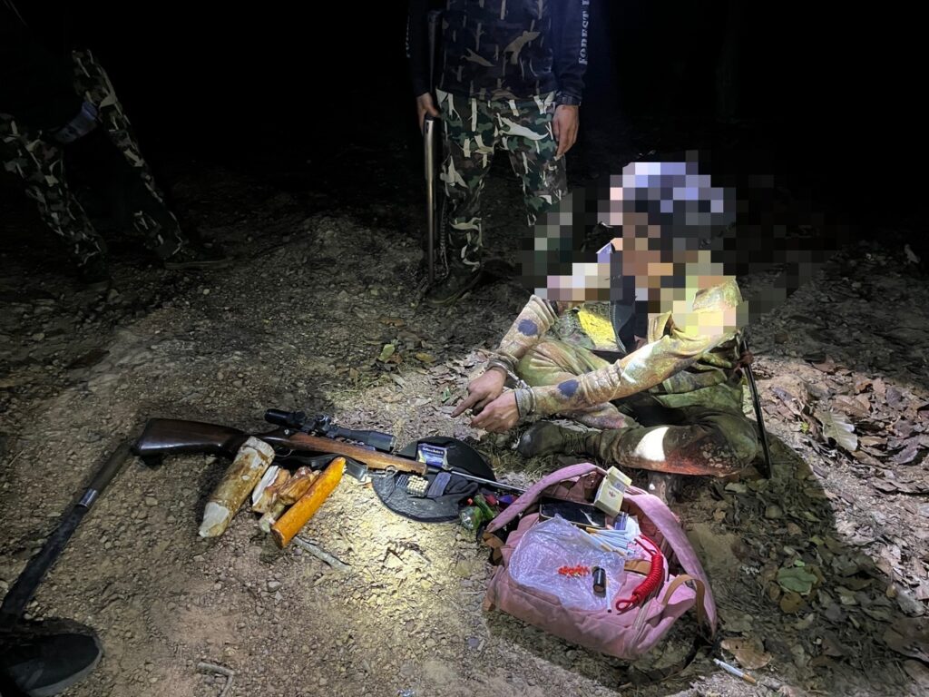 เมื่อรถเข้ามาใกล้ พบเป็นชาย 2 คน สะพายอาวุธปืนคนละกระบอก แต่ผู้ต้องหาทั้งสองไหวตัวทันและพยายามขับรถหลบหนีเข้าป่า เจ้าหน้าที่วิ่งไล่ติดตาม ก่อนสามารถจับกุมได้ 1 ราย พร้อมรถจักรยานยนต์ 1 คัน ส่วนอีก 1 รายหลบหนีไปได้