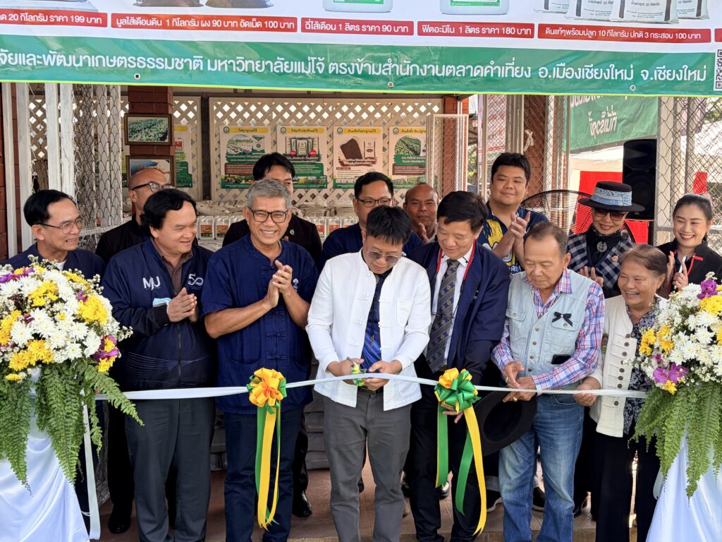 ที่ตลาดคำเที่ยง อำเภอเมือง จังหวัดเชียงใหม่ ซึ่งเป็นแหล่งจำหน่ายสินค้าด้านการเกษตรขนาดใหญ่ของจังหวัด ผู้ช่วยศาสตราจารย์ ดร.สุริยจรัส เตชะตันมีนสกุล รองอธิการบดีมหาวิทยาลัยแม่โจ้ เป็นประธานเปิด “ร้านค้าศูนย์วิจัยและพัฒนาเกษตรธรรมชาติ มหาวิทยาลัยแม่โจ้ สาขาตลาดคำเที่ยง” อย่างเป็นทางการ เพื่อเป็นศูนย์รวมสินค้าเกษตรอินทรีย์และผลิตภัณฑ์ออร์แกนิกที่พัฒนาโดยมหาวิทยาลัย ส่งตรงถึงประชาชนและเกษตรกร