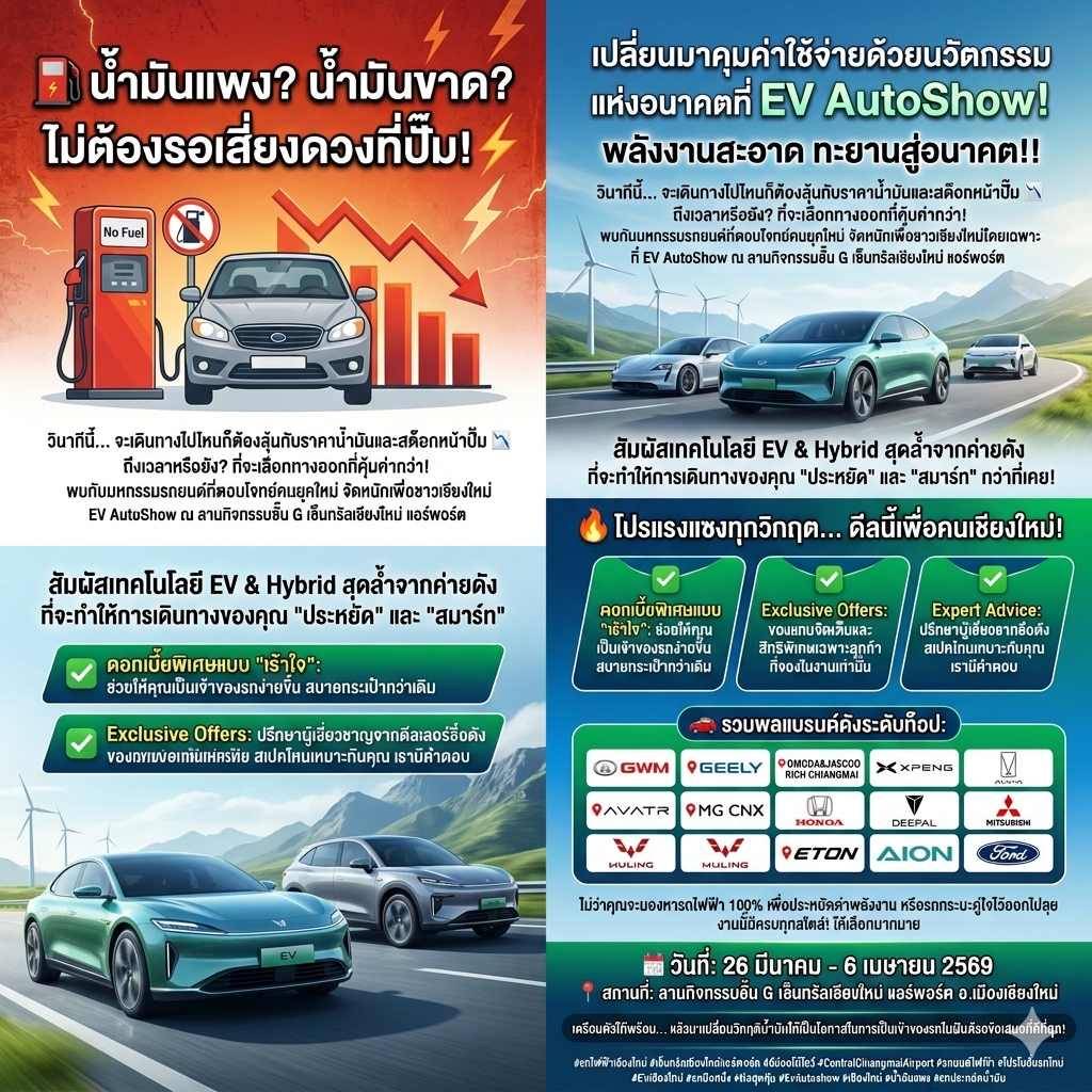 วินาทีนี้… จะเดินทางไปไหนก็ต้องลุ้นกับราคาน้ำมันและสต็อกหน้าปั๊ม 📉 ถึงเวลาหรือยัง? ที่จะเลือกทางออกที่คุ้มค่ากว่า! พบกับมหกรรมรถยนต์ที่ตอบโจทย์คนยุคใหม่ จัดหนักเพื่อชาวเชียงใหม่โดยเฉพาะที่ EV AutoShow