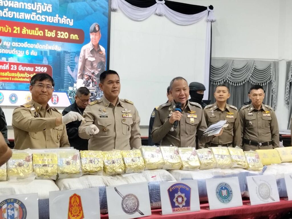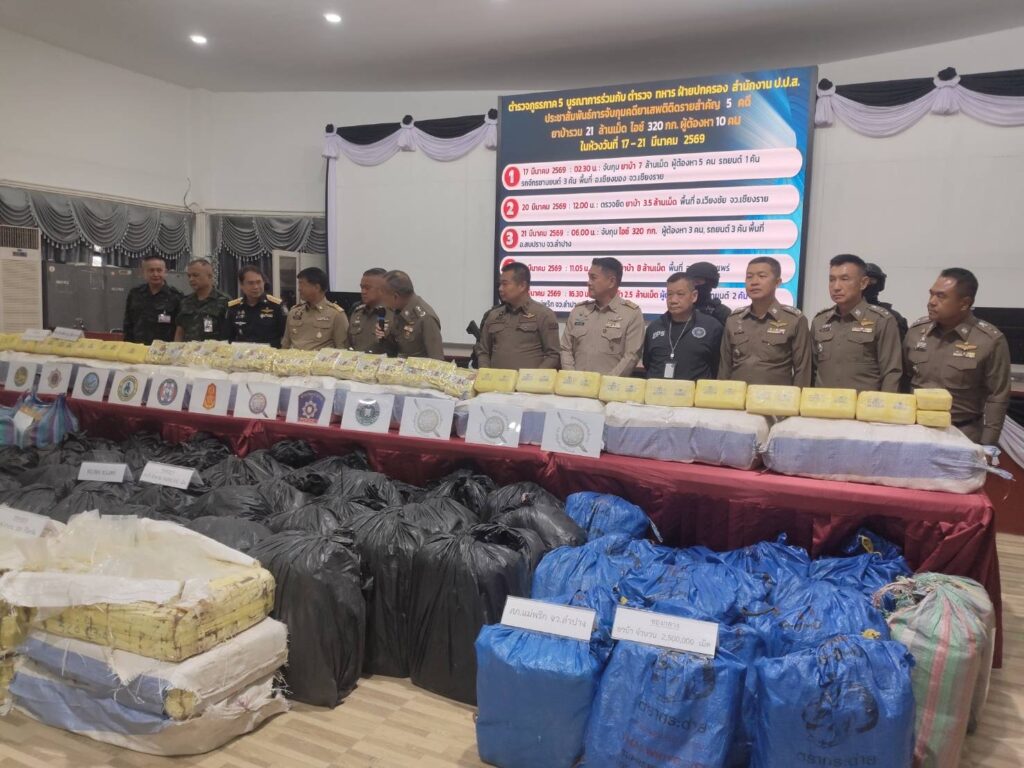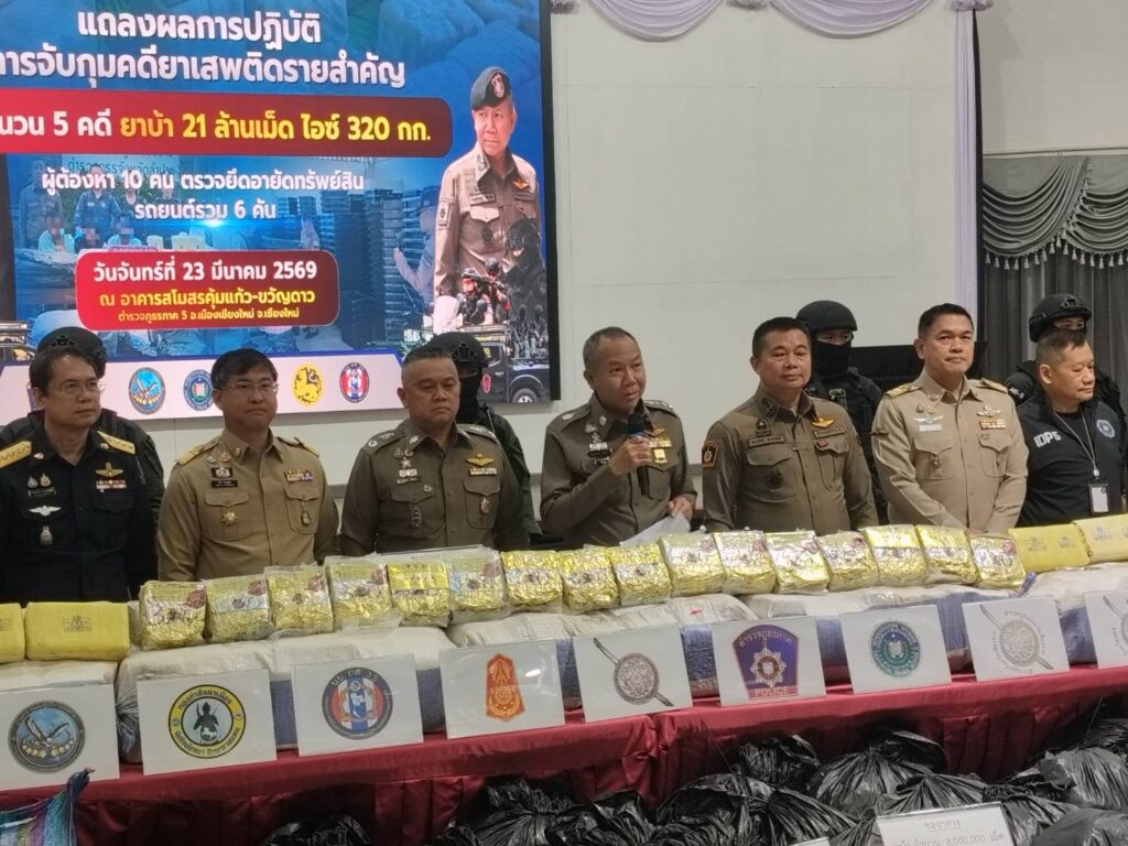 ​เมื่อวันที่ 23 มีนาคม 2569 สำนักงานตำรวจแห่งชาติ โดยกองบัญชาการตำรวจภูธรภาค 5 แถลงผลการจับกุมยาเสพติดรายสำคัญรวม 5 คดี จับกุมผู้ต้องหาได้ทั้งหมด 10 คน พร้อมของกลางยาบ้า 21 ล้านเม็ด และไอซ์ 320 กิโลกรัม ซึ่งเป็นการบูรณาการร่วมกันระหว่างตำรวจ ทหาร และฝ่ายปกครอง ตามนโยบายเร่งด่วนของรัฐบาล