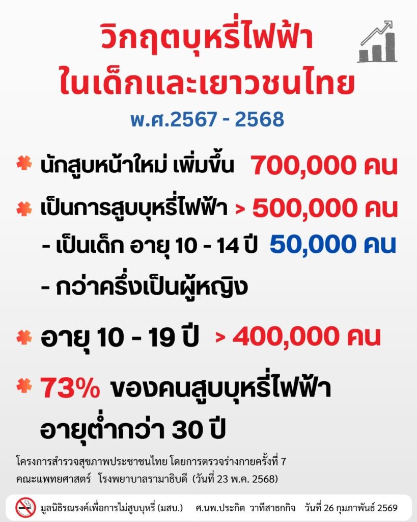 ในจำนวนนี้ 5 แสนคนสูบบุหรี่ไฟฟ้า และ 5 หมื่นคนอายุ 10-14 ปี (ตำ่กว่า 10 ขวบไม่มีการสำรวจ)