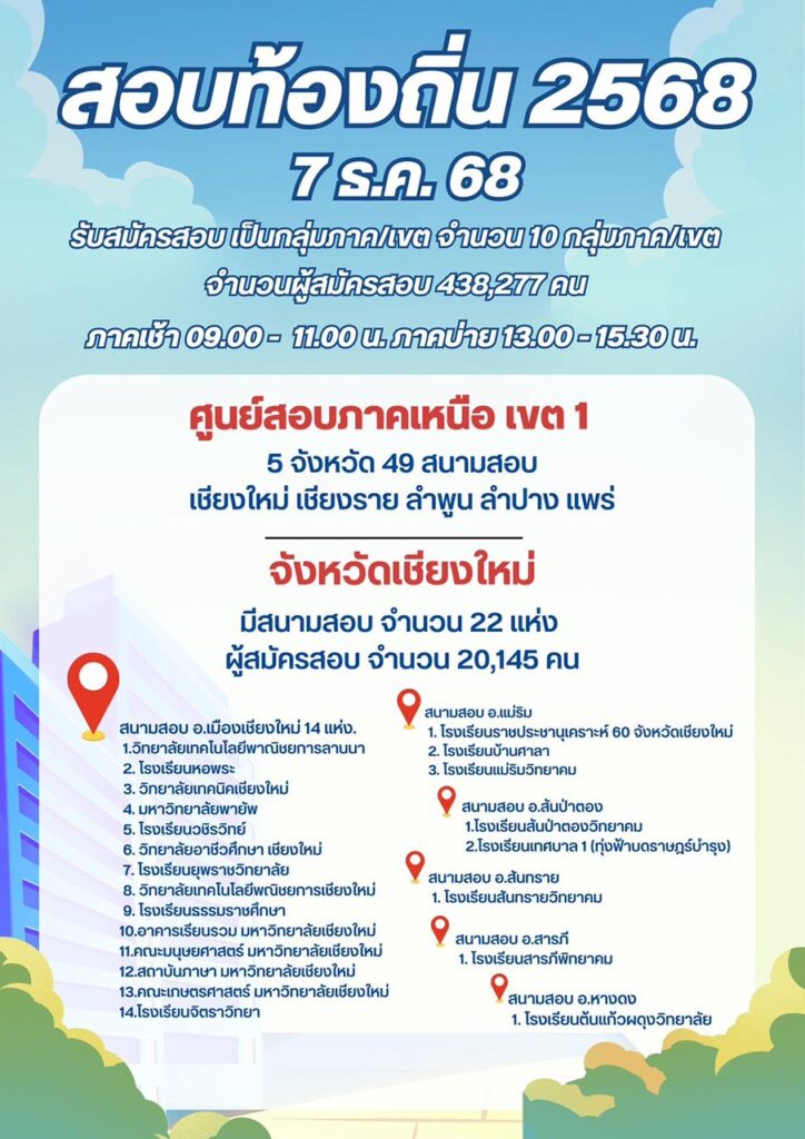 เชียงใหม่ เตรียม 22 สนามสอบ ใน 6 อำเภอ รองรับการสอบท้องถิ่น 2568 ช่วงวันหยุดยาว 7 ธันวาคม นี้ ผู้เข้าสอบและผู้สัญจรโปรดวางแผนการเดินทาง