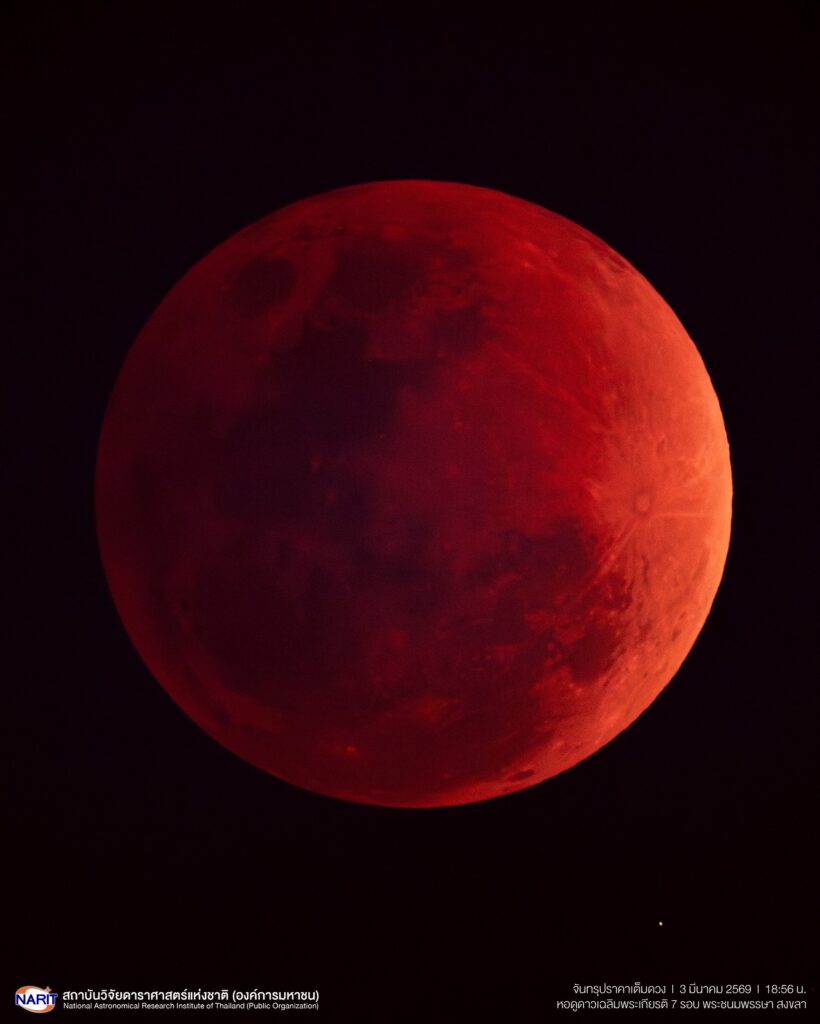 ปรากฏการณ์จันทรุปราคาเต็มดวง หัวค่ำวันมาฆบูชา 3 มีนาคม 2569 บันทึกเมื่อเวลาประมาณ 18:56 น.